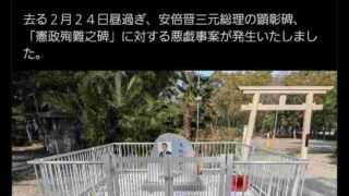 嫌儲護国神社「安倍晋三の石碑が荒らされました(柵に囲われた石碑の写真ペタッ」 心無い人「死後は牢屋にぶち込まれたのか😁」