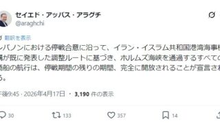嫌儲【高市朗報】イランアラグチ外相「ホルムズ海峡を通過するすべての商船の航行は、停戦期間の残りの期間、完全に開放される」