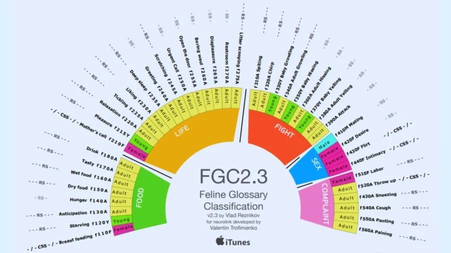 Reznikov博士は以前から猫の発する音声を体系化する「FGC(FelineGlossaryClassification)」と呼ばれる分類法に取り組んでおり、今回はその最新版FGC2.3にもとづいて大規模なデータ収集とAIモデル訓練を行いました。