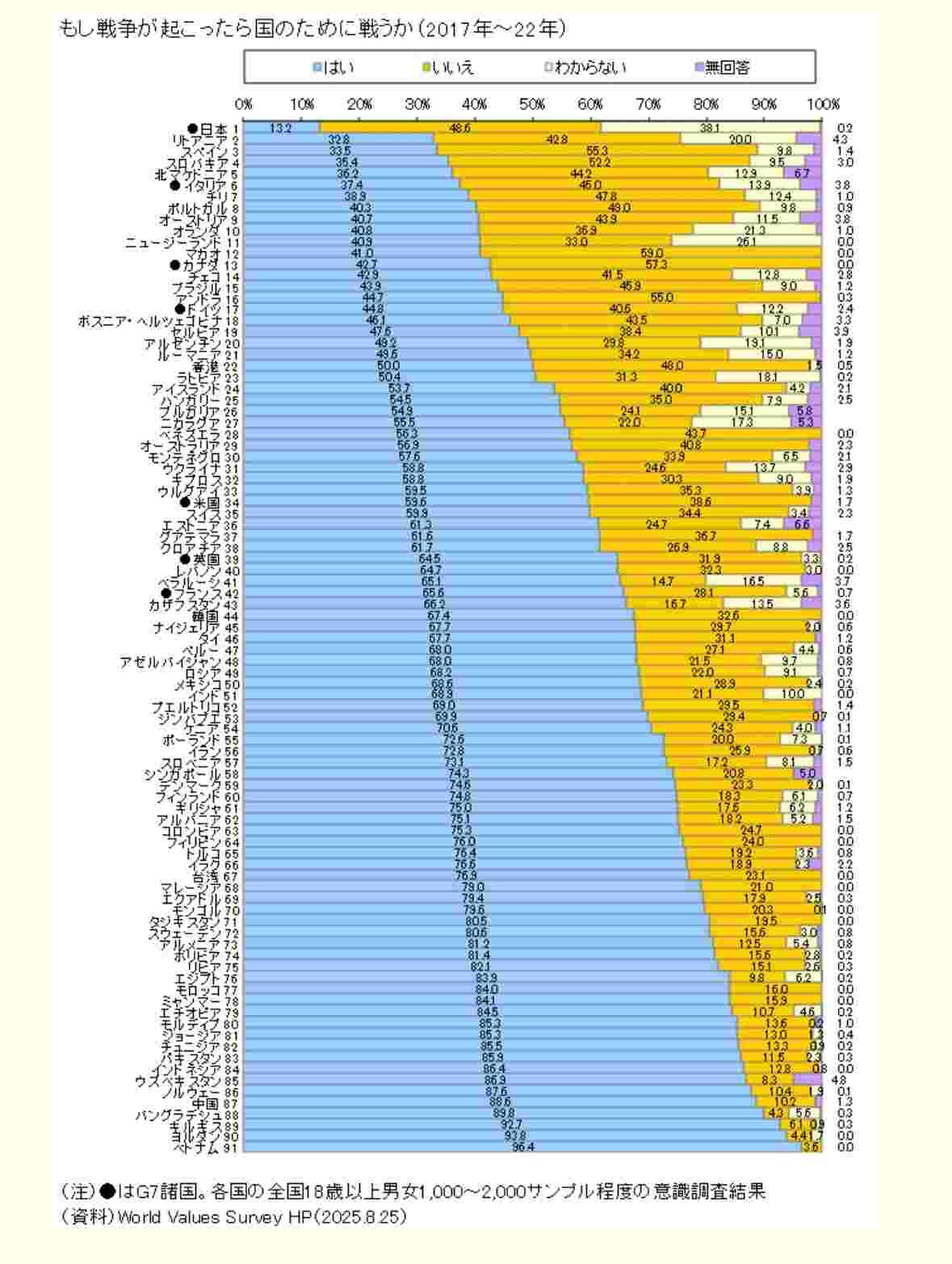 「もし戦争が起こったら国のために戦いますか?」「はい」日本13%、世界最下位