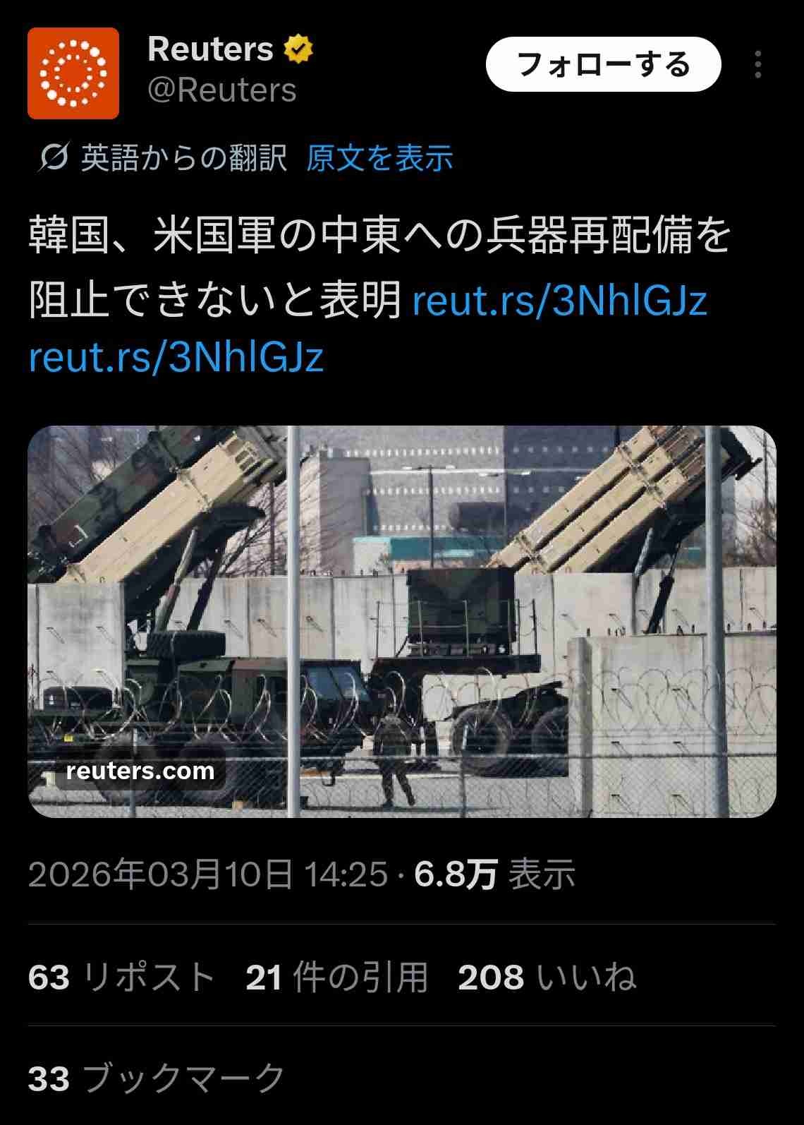 🇰🇷「アメリカちゃん!!東アジアの米軍の防空ミサイルを中東に持ってかないで!!」🇺🇸「うるさいですね(シコシコ」