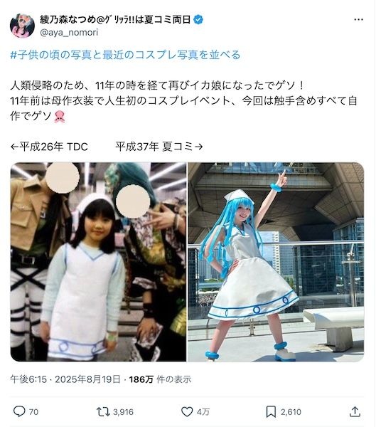 11年の時を経ても変わらないイカ娘への愛と、大きく変わったコスプレへの熱量を感じる投稿は、Xで4万件を超すいいねを獲得。コメント欄などには「凄いでゲソ!」「両方ともかわいい」「なんか泣ける」といった称賛の声が相次いでいます。