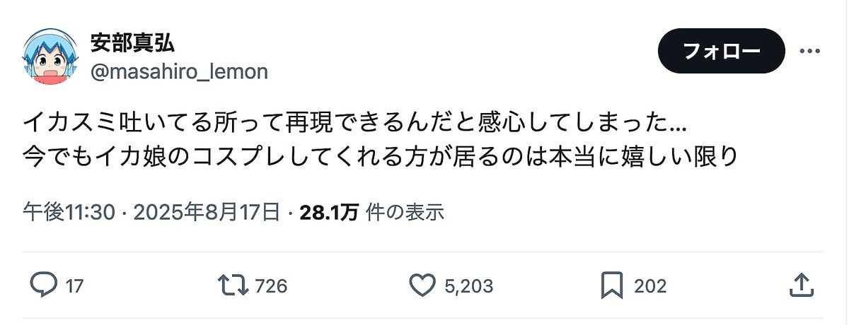 こちらは原作者の安部真弘氏にも届き「イカスミ吐いてる所って再現できるんだと感心してしまった…今でもイカ娘のコスプレしてくれる方が居るのは本当に嬉しい限り」と感激されていました。