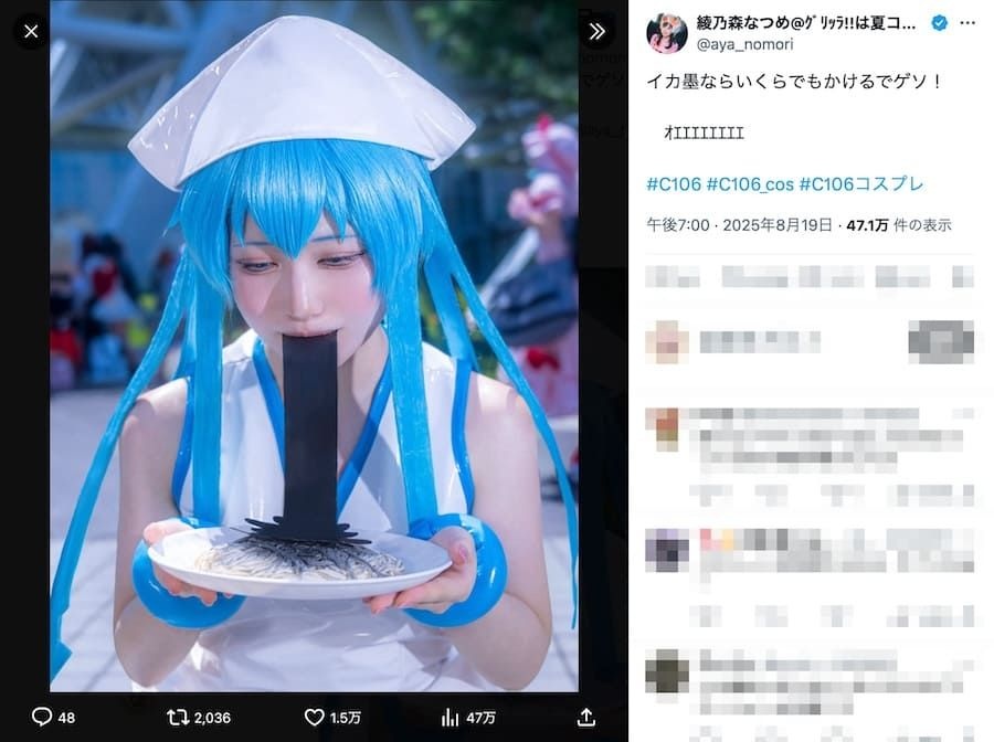 さらに綾乃森さんはイカ娘のかわいい姿以外にも、おなじみの“口からイカ墨を吐くシーン”も再現。創意工夫にあふれる小道具と、墨吐き時の独特な表情が大きな話題を集めました。