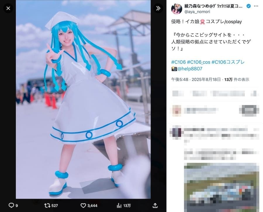 そして11年後の現在、2025年8月に開催されたC106の際には、綾乃森さんは自作衣装で参加。初参加時も身につけていた白ワンピース&白三角形をバージョンアップさせつつ、腕輪や靴、特徴的な青い触手を追加しています。
