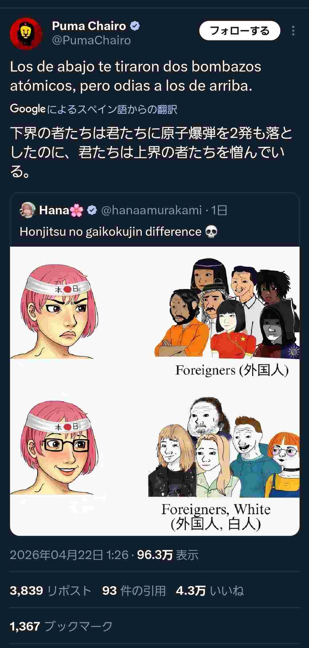 欧米文化や白人はカッコいい美しい憧れ、アジアアフリカは土人、中東はテロというイメージで - 66 : 2026/04/22(水) 13:25:05.37 ID:SUTq+/pJ0