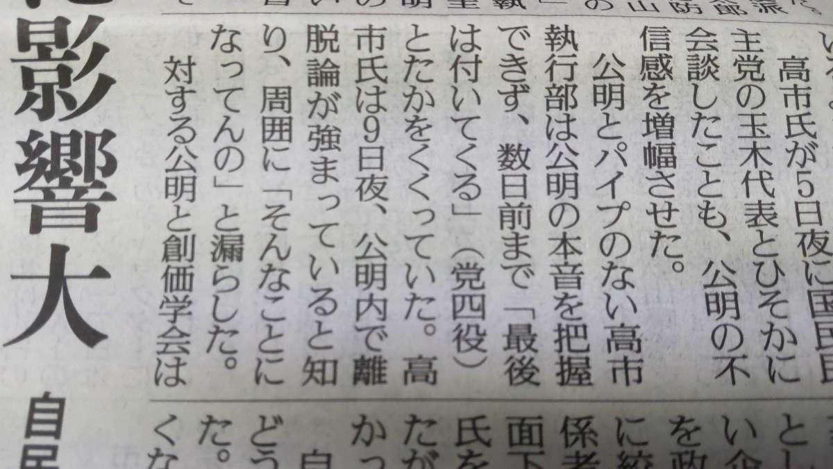 https://www.yomiuri.co.jp/politics/20251010-OYT1T50194/「高市執行部は公明の本音を把握できず(中略)高市氏は9日夜、公明内で離脱論が強まっていると知り、周囲に『そんなことになってんの』と漏らした」