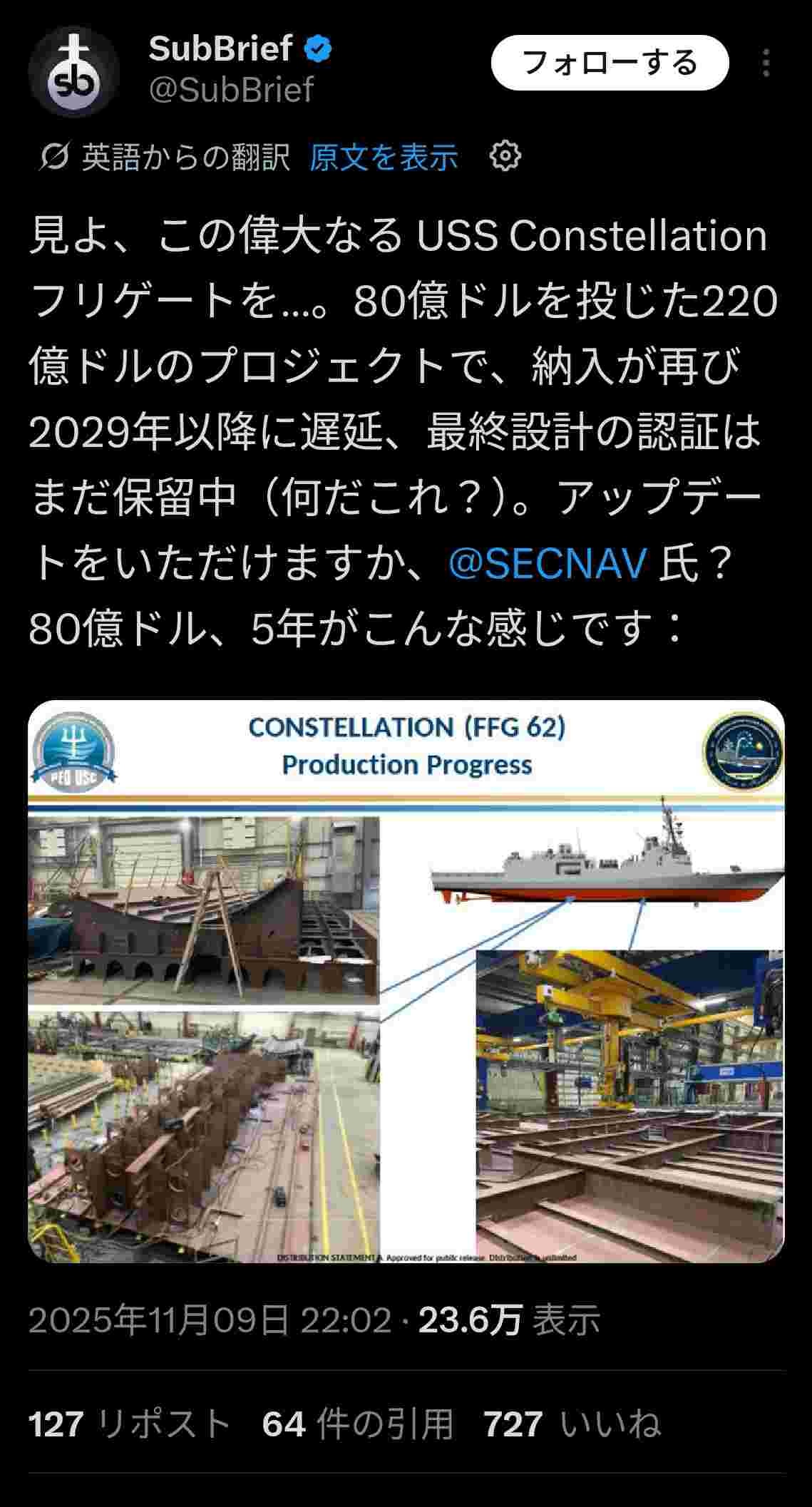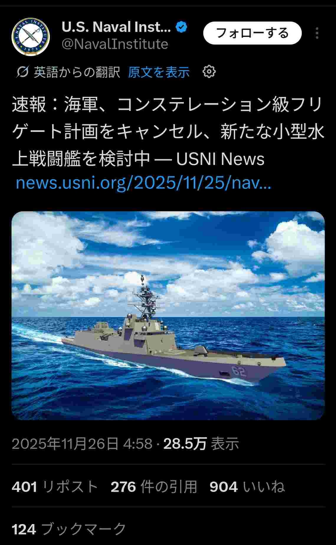 【いつもの】🇺🇸アメリカ海軍、1兆円以上注ぎ込んだフリゲート艦建造計画をキャンセルwww