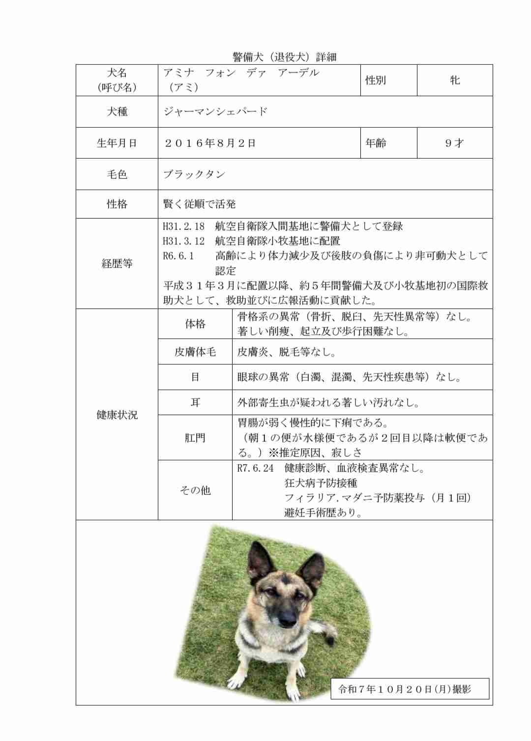 【お知らせ】自衛隊小牧基地で引退する警備犬の里親を募集中。車に爆薬が仕掛けられても安心!