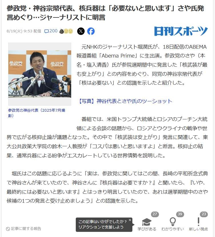 【さや悲報】参政党神谷「核兵器は最終的には必要ないと思います、あれは選挙期間中のさや候補の1つの発言」