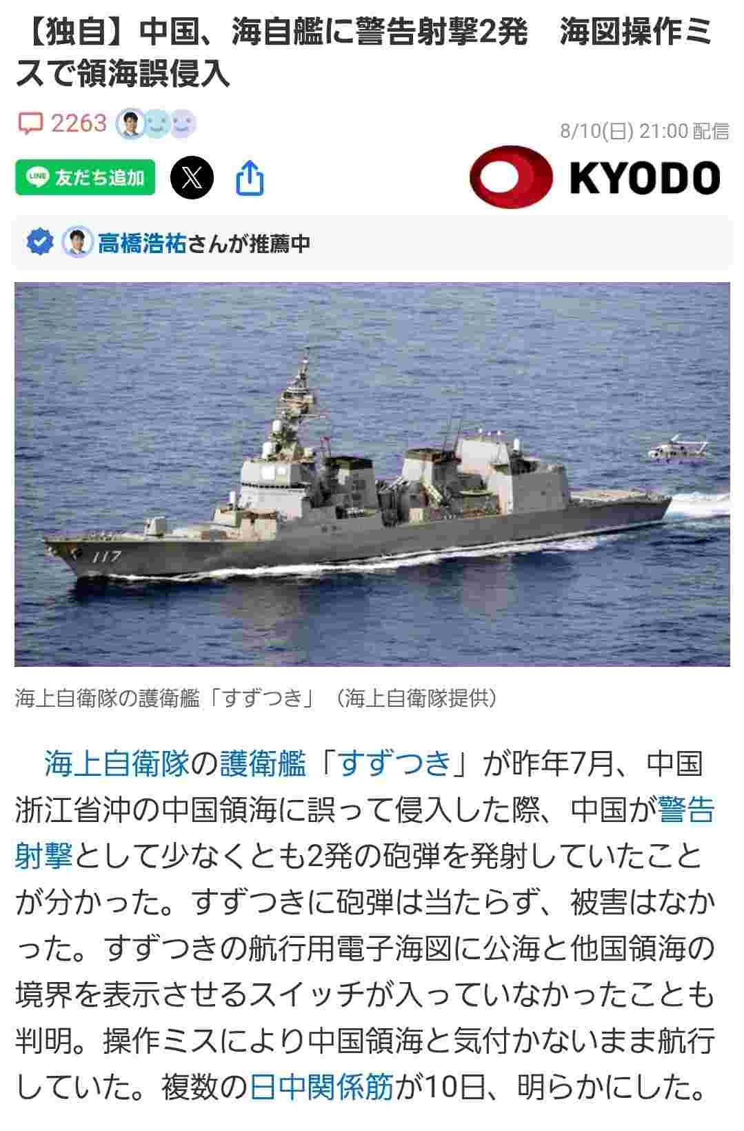 【独自】中国、海自艦に警告射撃2発 海図操作ミスで領海誤侵入 | 日本海新聞 NetNihonkai海上自衛隊の護衛艦「すずつき」が昨年7月、中国浙江省沖の中国領海に誤って侵入した際、中国が警告射撃として少なくとも2発の砲弾を発射していたことが分かった。すずつきに砲弾は当たらず、被害はなかった。す…www.nnn.co.jphttps://www.nishinippon.co.jp/item/1386943/www.nishinippon.co.jp