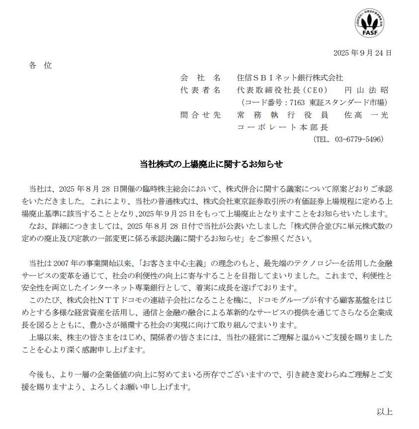 - 住信SBIネット銀行は9月25日に東京証券取引所スタンダード市場への上場を廃止した。NTTドコモによるTOBが成立し、連結子会社になったことに伴い、上場廃止基準に該当するため。「より一層の企業価値の向上に努める」としている。