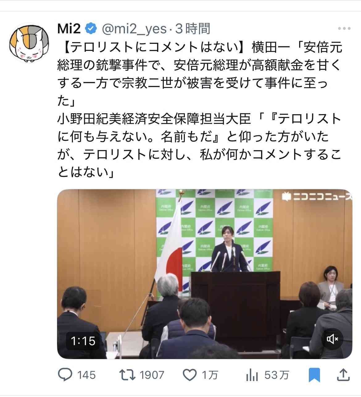 【動画】小野田紀美大臣 統一協会と安倍晋三氏銃撃の関連を問われ「テロリストに語る言葉などない!」とピシャリ!
