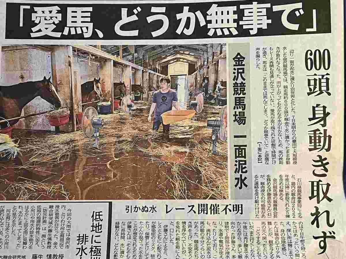 関係者が総力戦を展開し、馬の移送が進む中、全国からのエールも続々と寄せられている。午前7時過ぎの金沢競馬場。調教師や厩務員(きゅうむいん)らが水をかき分けて馬を厩舎(きゅうしゃ)から競馬場前まで誘導し、馬運車に乗せて石川県内外の牧場へ送り出した。