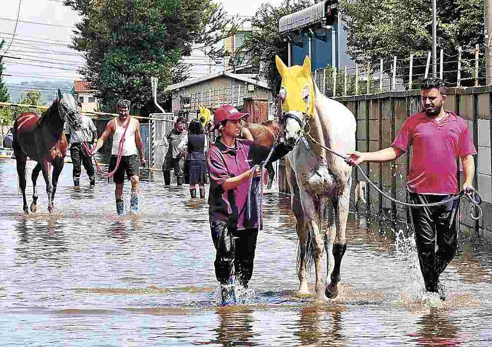 競馬場では浸水から丸一日たち、レース場や駐車場などの水は引いたが、厩舎は深い所で膝上まで水が残り、馬は身動きが取れなくなっていた。競馬場に所属する約600頭のうち、各厩舎は一部の馬を避難させることを決断。