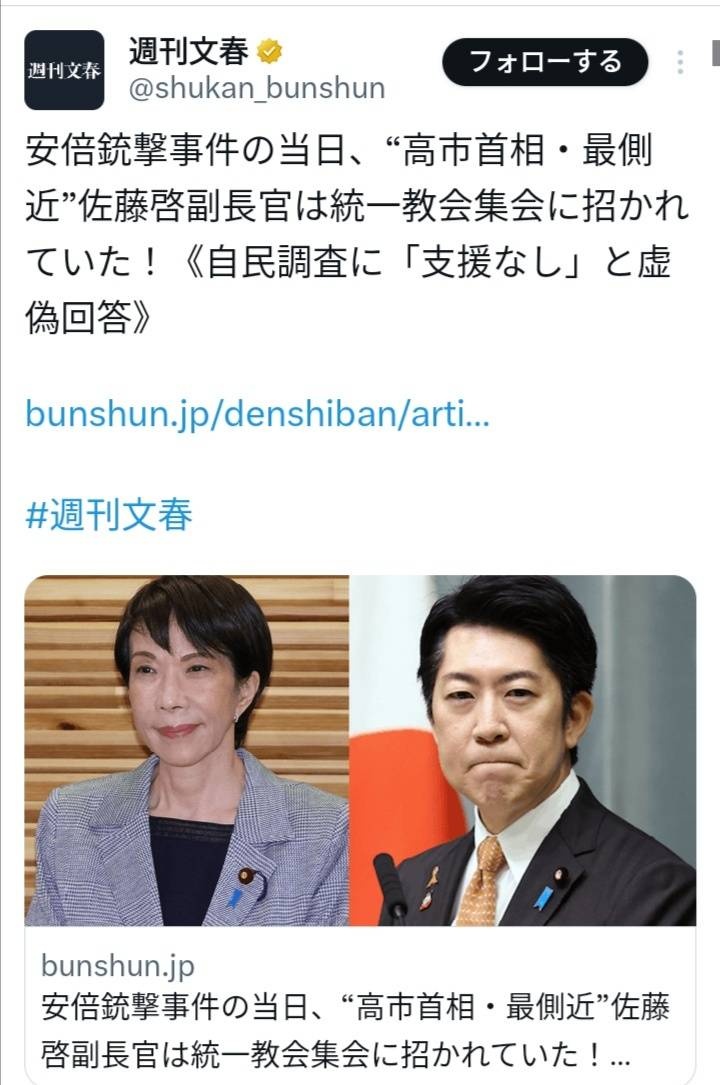 【文春】高市早苗の側近、安倍晋三が射殺された日に統一教会でパーティー。自民アンケートには統一からの支援無しと虚偽の回答。