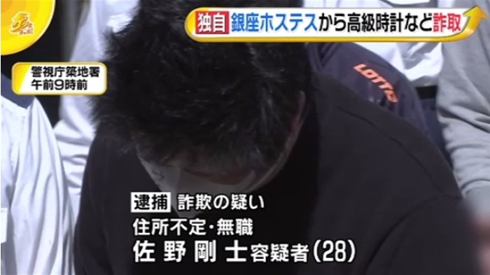 客の28歳の男が警視庁に逮捕されていたことがわかりました。逮捕されたのは、住所不定・無職の佐野剛士容疑者(28)で、去年9月ごろ、銀座のクラブて知り合った