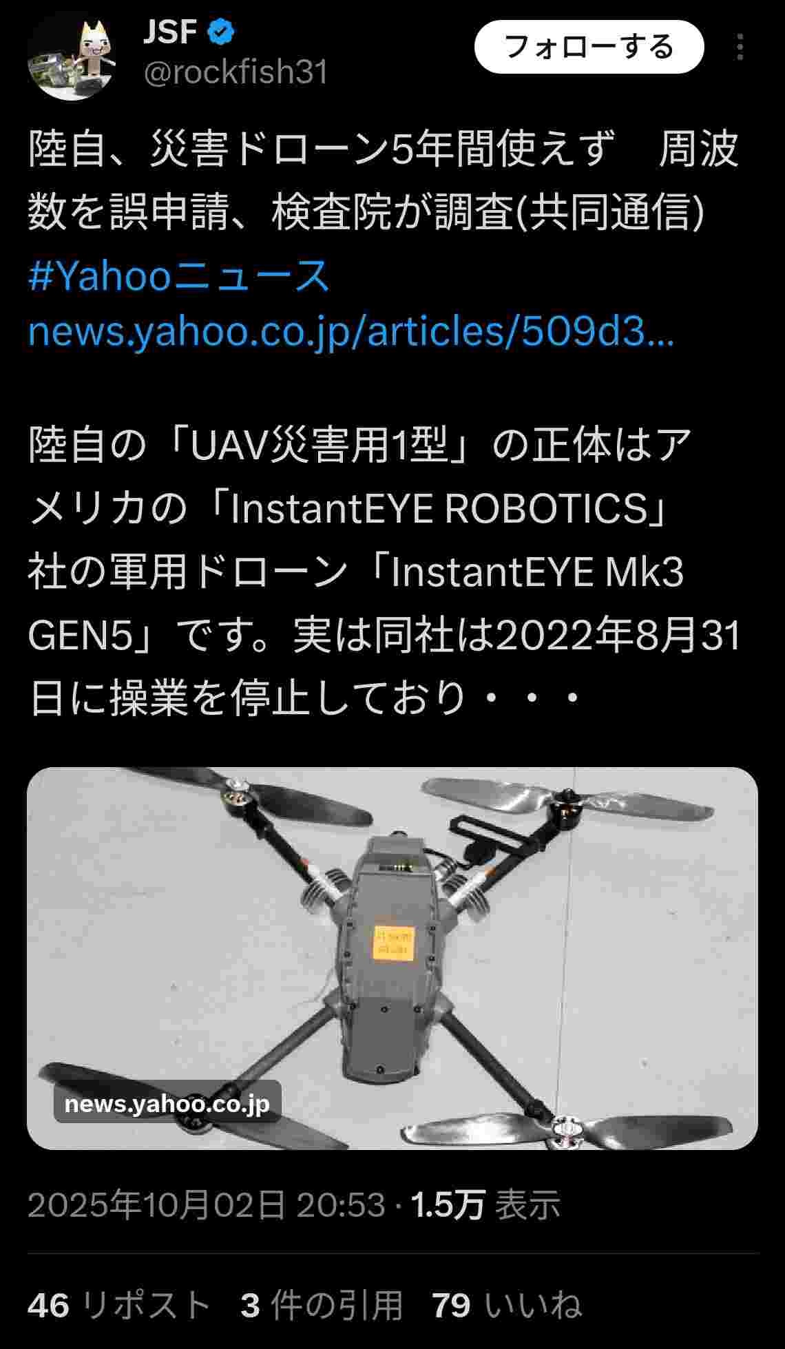 https://news.yahoo.co.jp/articles/509d373c64d8828e201594866d3aef5edf18eeb2陸上自衛隊が2020年に米国製の災害用ドローン40機を調達したものの、今年7月までの約5年間、使用できない状態だったことが2日、会計検査院の調査で分かった。ドローンを飛ばす際に使用する周波数を誤って申請していたことなどが原因。