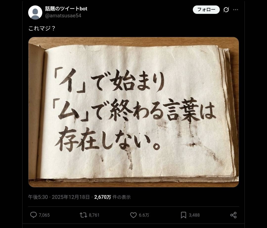 【画像】「イで始まって厶で終わる日本語の単語は存在しません」6万いいね