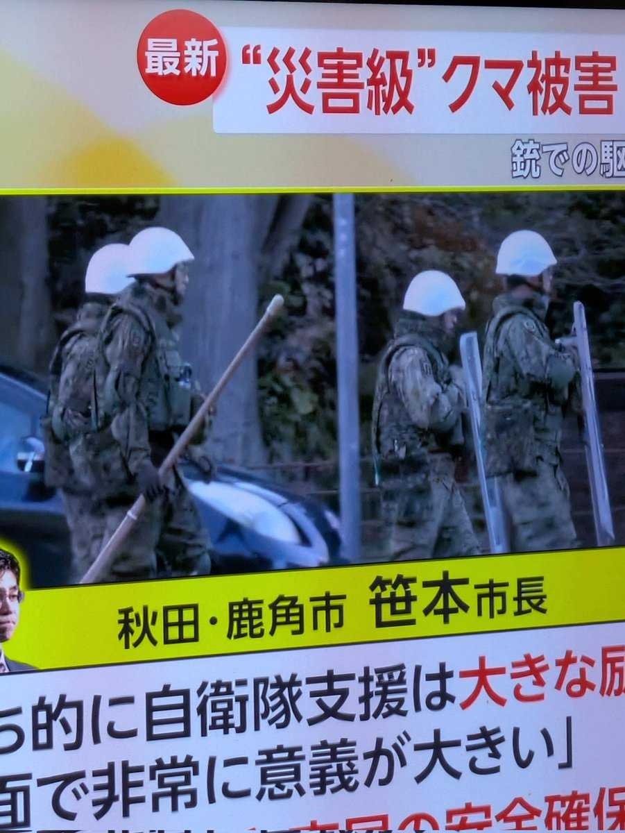 自衛隊がクマ対策開始、秋田でわな輸送 護身は「木銃」やスプレーで(朝日新聞) - Yahoo!ニュース陸上自衛隊は5日、秋田県内で、箱わなの輸送などクマ対策の活動を始めた。クマ被害対策を目的とした自衛隊派遣は異例で、自衛隊法100条などに基づく「民生支援」の形で今月30日まで従事する。 秋田県news.yahoo.co.jp - 2 : 2025/11/05(水) 18:42:39.034 ID:cpNYxXCKy