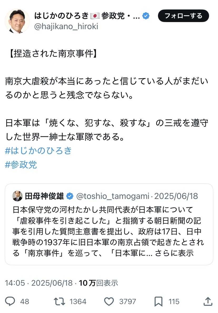 【画像】国会議員「南京大虐殺は明らかな捏造。日本軍は「焼くな、犯すな、56すな」の三戒を遵守した世界一紳士な軍隊だった。」