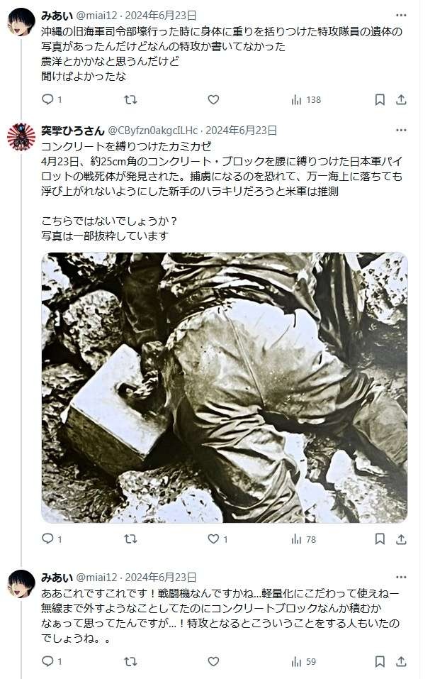 【画像】特攻隊さん、不時着水した時に確実に死ぬように腰にコンクリの重石をつけらていた…🥺