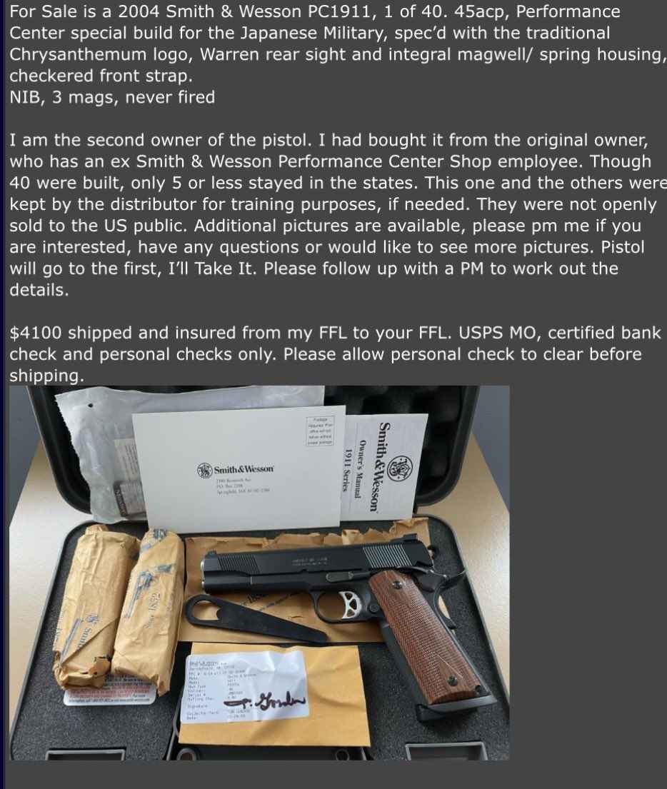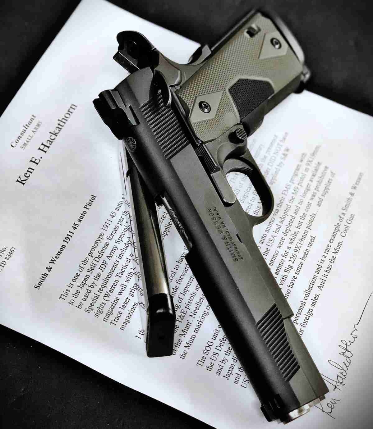 - 自衛隊の某部隊のオーダーで作られたS&W PCの1911カスタムが出品された。40丁が作られ殆どが納品され5丁程度が米国に残ったんだけど私の持ってるのはケンハッカーソン先生からのでレーザーグリップが付いてる。ケンからこの銃の由来はまだ言っちゃダメって言われてるけど時期が来たらちゃんと書こう。