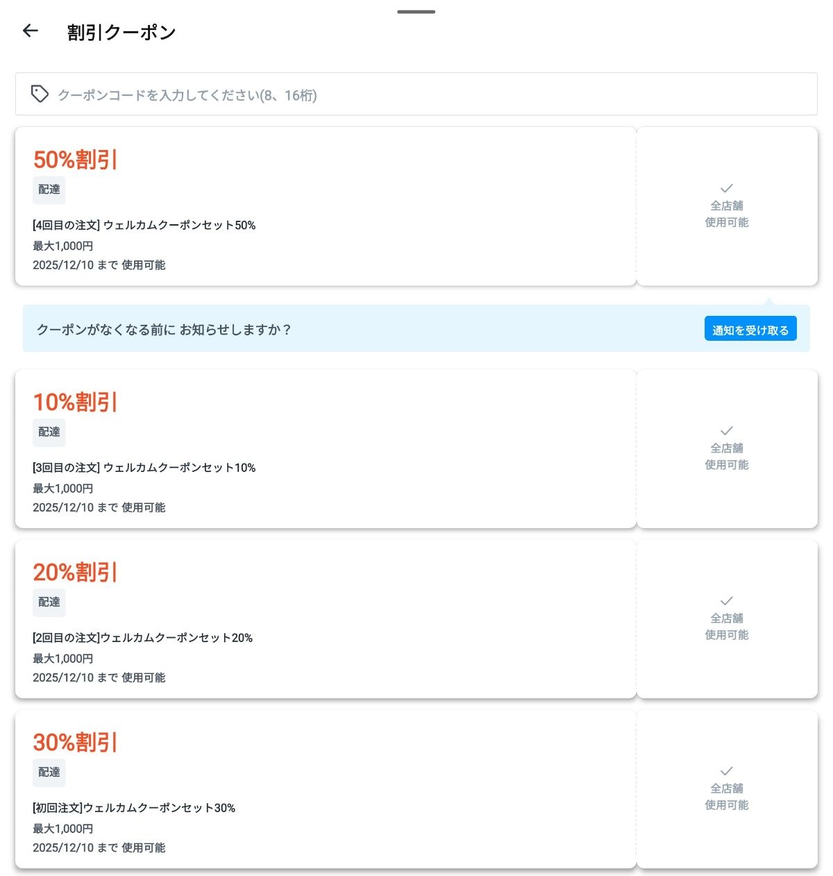3回目注文: 30%OFF(上限1,500円)6500円以上の配達しない限り↑の招待なしクーポンのがお得やで