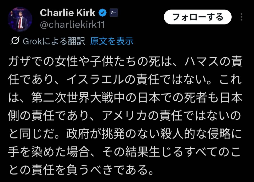 - イスラエルと米国のユダヤ系団体が保守系団体代表の殺害に激怒してるって、一体何があったのか気になるな。