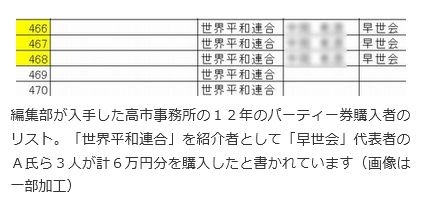 高市氏の政治資金パーティーのパーティー券を世界平和統一家庭連合(旧統一教会)の関連団体が