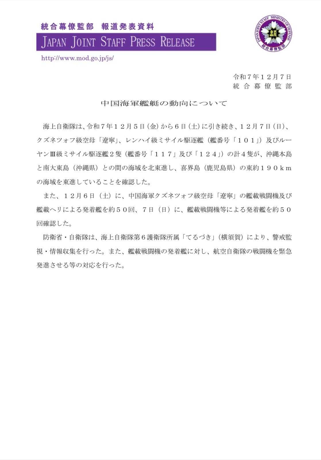 【超速報】中国軍空母「遼寧」、喜界島の東約190キロまで進出 防衛省発表