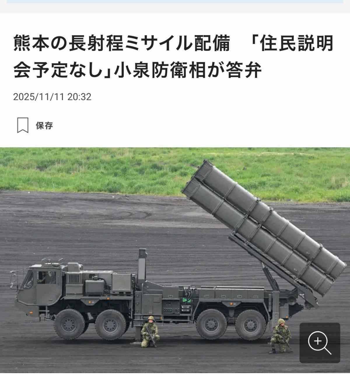 有事の際の「反撃能力」(敵基地攻撃能力)となる長射程ミサイルを熊本市東区の陸上自衛隊健軍駐屯地に最初に配備する計画を巡り、小泉進次郎防衛相は11日の衆院予算委員会で「現時点で住民説明会を実施する予定はない」と述べた。健軍駐屯地近くの商店街では9日に主催者発表で約1200人が参加した集会があり、配備