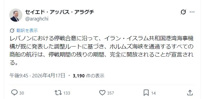 【高市朗報】イランアラグチ外相「ホルムズ海峡を通過するすべての商船の航行は、停戦期間の残りの期間、完全に開放される」
