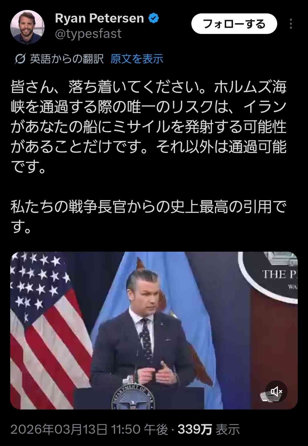 【高市朗報】ヘグセス「みんな落ち着いて!😤ホルムズ通るのに唯一のリスクはミサイルが飛んでくるかもというだけ」