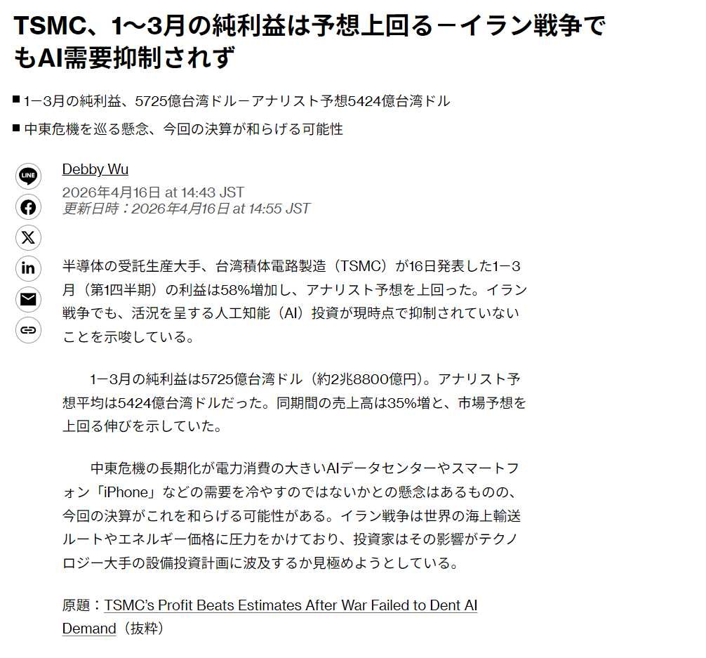【高市朗報】TSMC、1~3月の純利益は予想上回る、イラン戦争も関係なし、AI特需でウホウホ