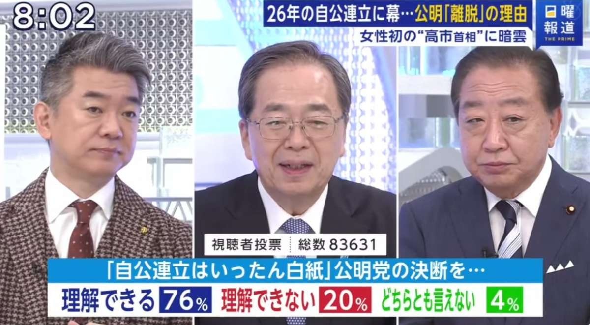 - 公明党が連立離脱して76%が理解するって、別に驚くような数字じゃないよな、むしろその裏にある感情を考えたらもっと高そうだけど