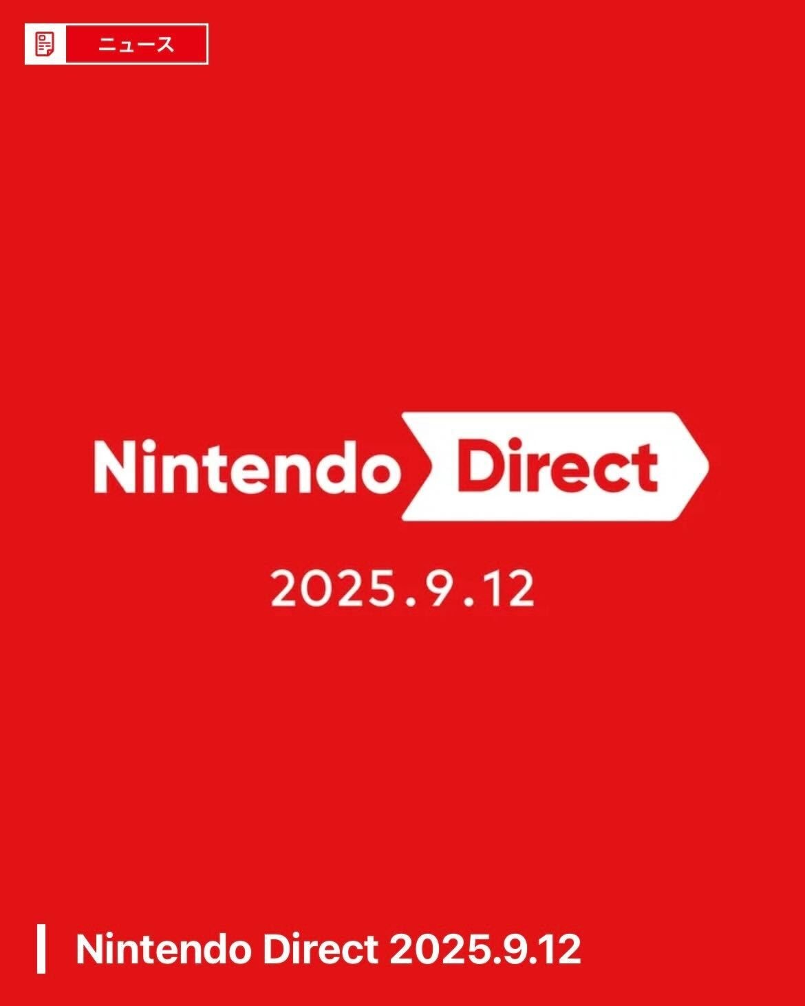 「Nintendo Direct 2025.9.12」は、任天堂がゲームタイトルなどを紹介する配信番組。今回はアプリ「Nintendo Today!」で案内されており、配信日と開始時間が発表された。このほか、任天堂公式Xでも案内されている。