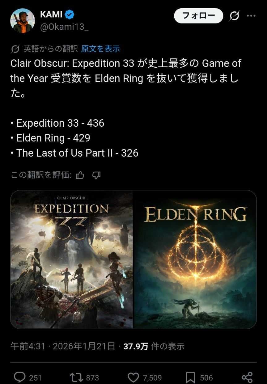エルデンが今年いたならなんとか33とかボロ負けしてたくらいクオリティに差があるし - 179 : 2026/01/21(水) 17:50:31.462 ID:uAFIkWz7R