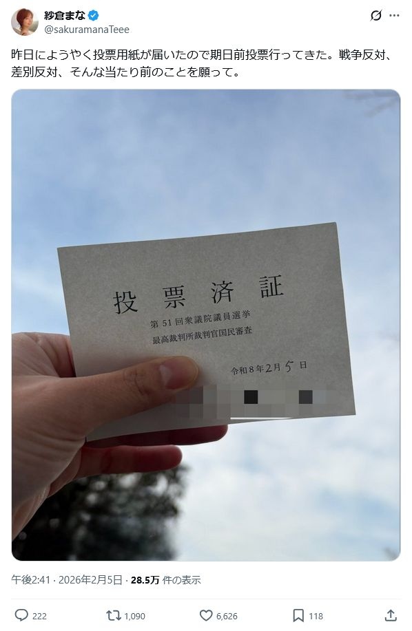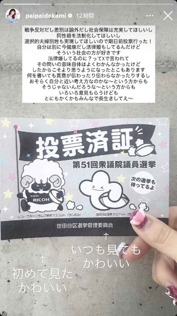 ぱいぱいでか美「戦争反対だから投票行った。みんなで長生きしよーぜ!」反高市か?