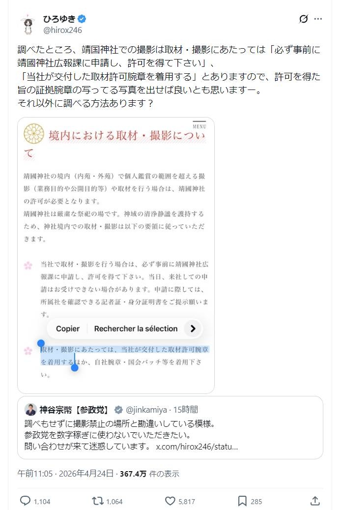 ひろゆき「調べたところ、靖国神社での撮影、事前に許可が必要」参政神谷「調べもせずに撮影禁止の場所と勘違いしている模様