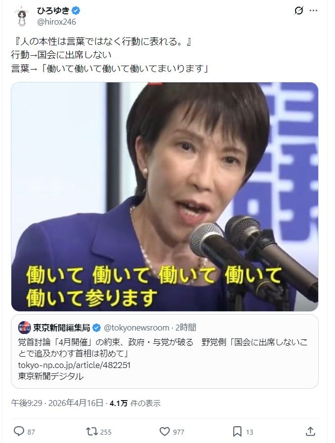 ひろゆき『人の本性は言葉ではなく行動に表れる。』行動→国会に出席しない言葉→「働いて働いて働いて働いてまいります」