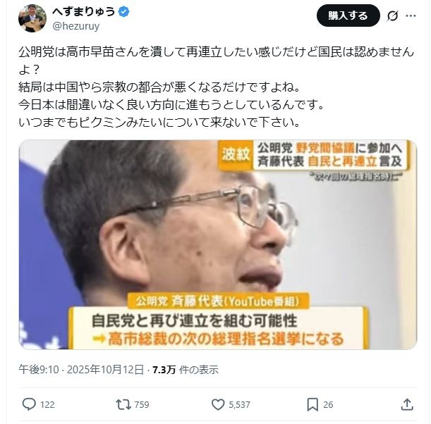 へずまりゅう「公明党は高市早苗さんを潰して再連立したい感じだけど国民は認めません、ピクミンみたいについて来ないで下さい