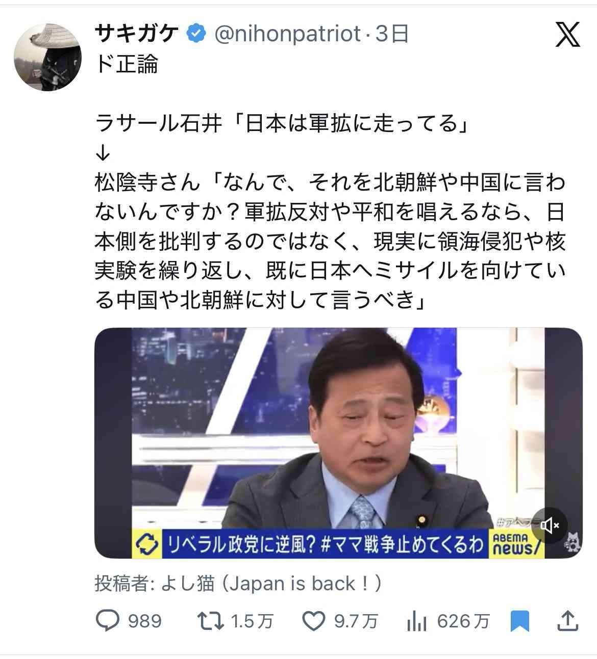 ぺこぱ「戦争反対って何故日本に言うんだ?中国に言え」