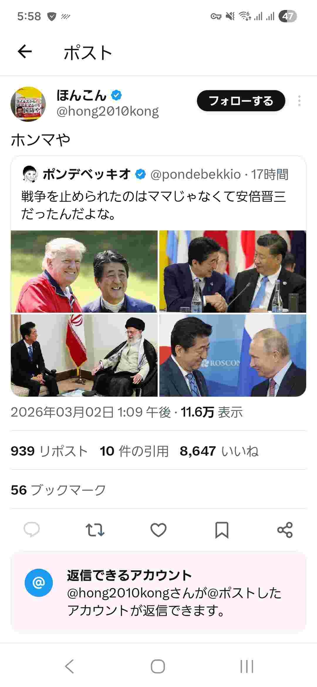 Xで見たけど安倍と色んな国の偉いさんが写ってる写真ポストして安倍さんはすごかったんだなとかツイートしてたのいたけど、安倍はウクライナロシアの戦争の時に生きてたろって思ったわ
