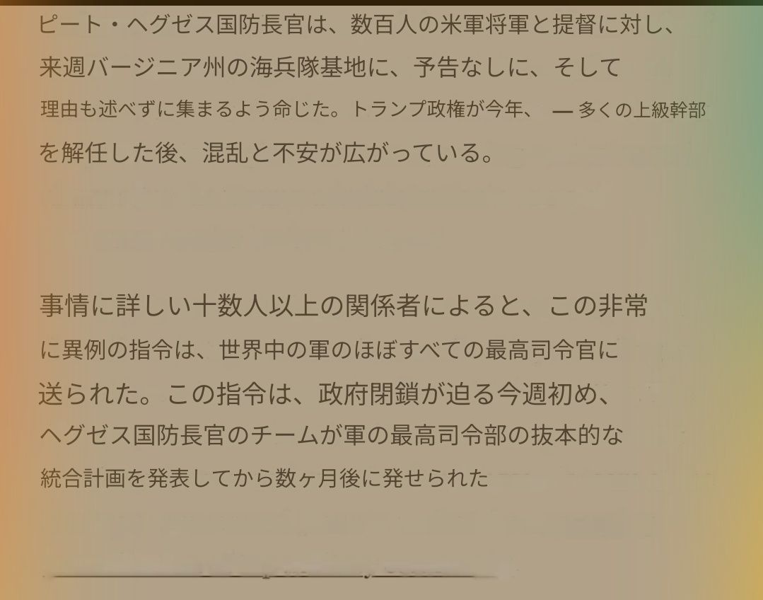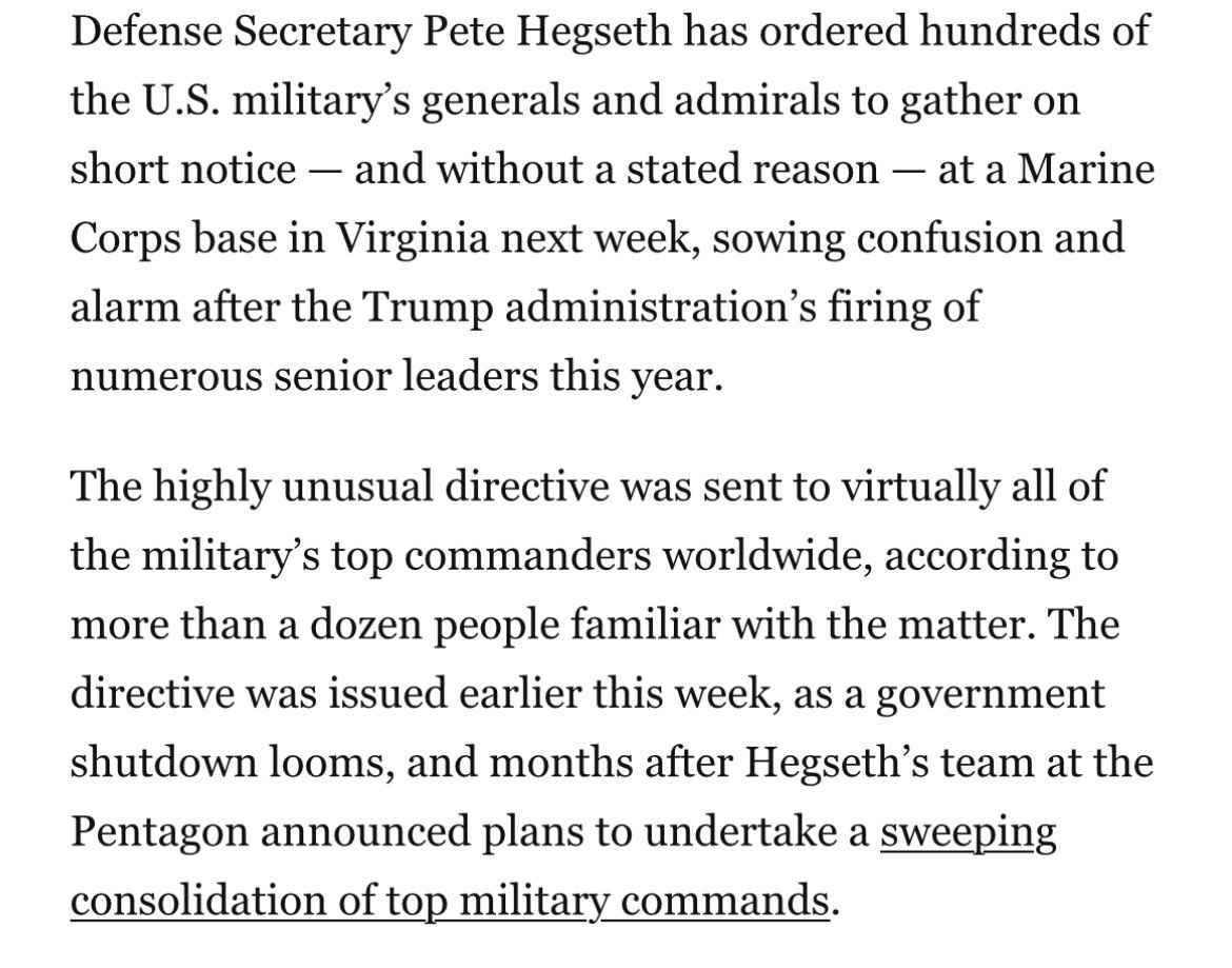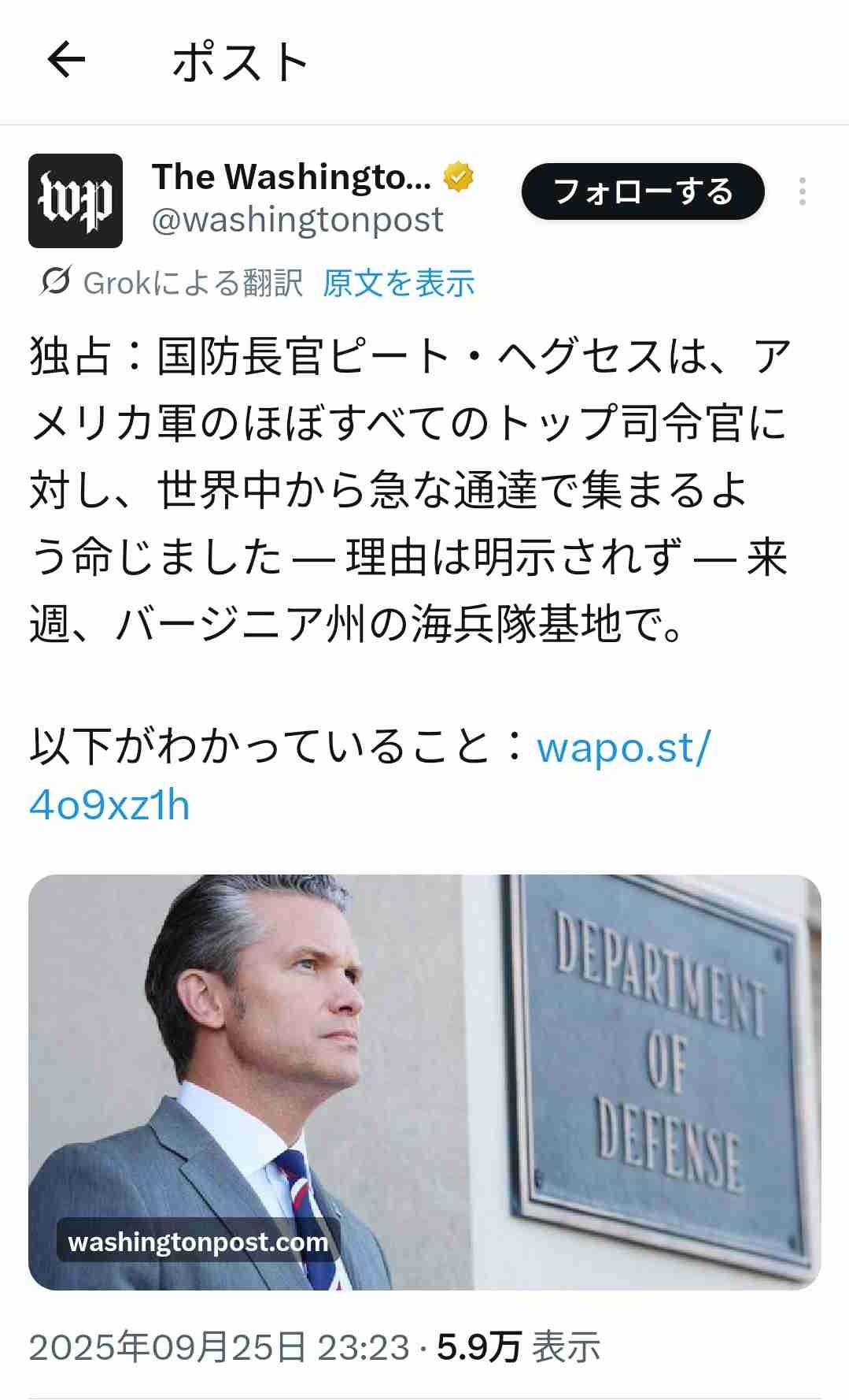 Faytuks News (@Faytuks) on XDefense Secretary Pete Hegseth has ordered hundreds of U.S. military generals and admirals to gather on short notice at a Marine Corps base in Virginia next wee...x.com- 2 : 2025/09/26(金) 00:20:12.44 ID:s9lS1var0