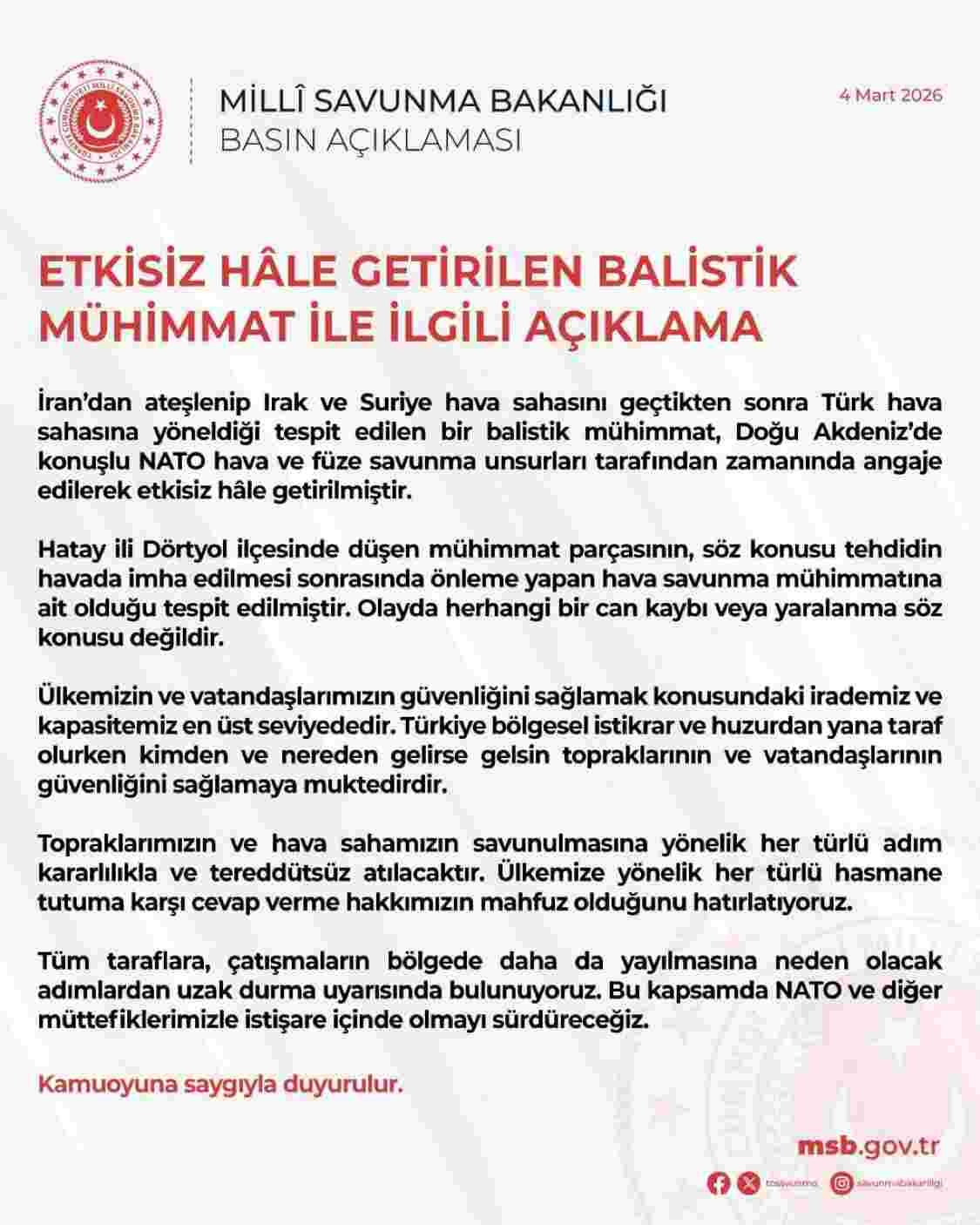 イランから発射され、イラクおよびシリアの領空を通過した後、トルコ領空に向かっていることが検知された弾道弾が、東地中海に配備されたNATOの防空・ミサイル防衛部隊によって適時に捕捉・係戦(エンゲージ)され、無力化されました。