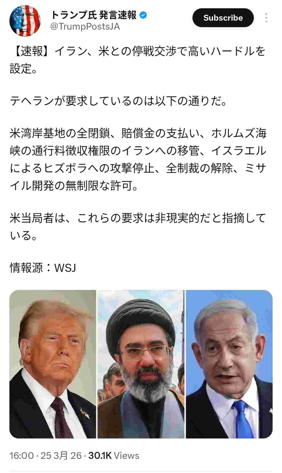 - トランプだのイスラエルメディアだのは好き放題言ってたけどイラン側からの停戦条件出たのはこれが初?