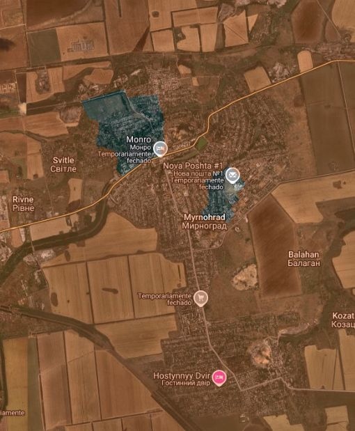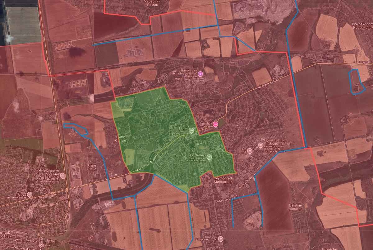 ディミトロフ中心部にウクライナ軍が最期まで防衛していましたが、陥落したので真っ赤になってます