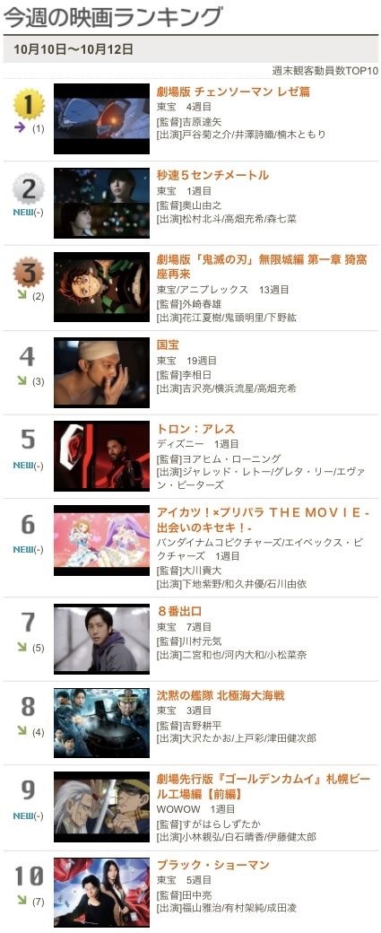 - 10月10~12日の全国映画動員ランキングは、以下の通り