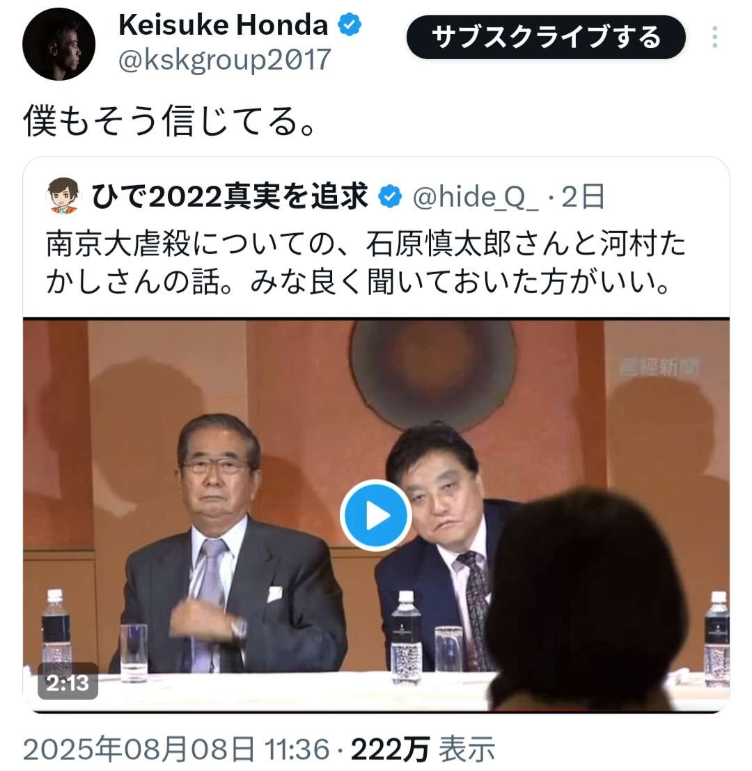 ケイスケ・ホンダ「南京大虐殺は無かった!」→「一次資料読み漁ったらありました、ごめんなさい」